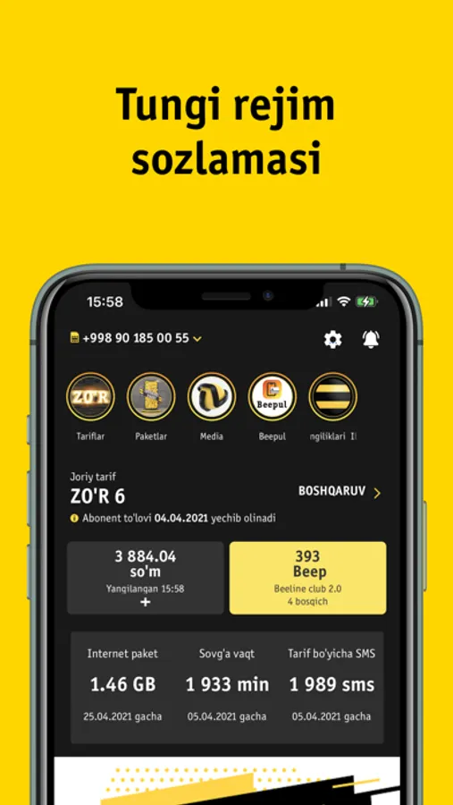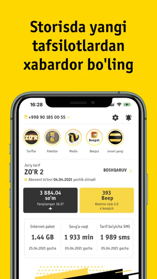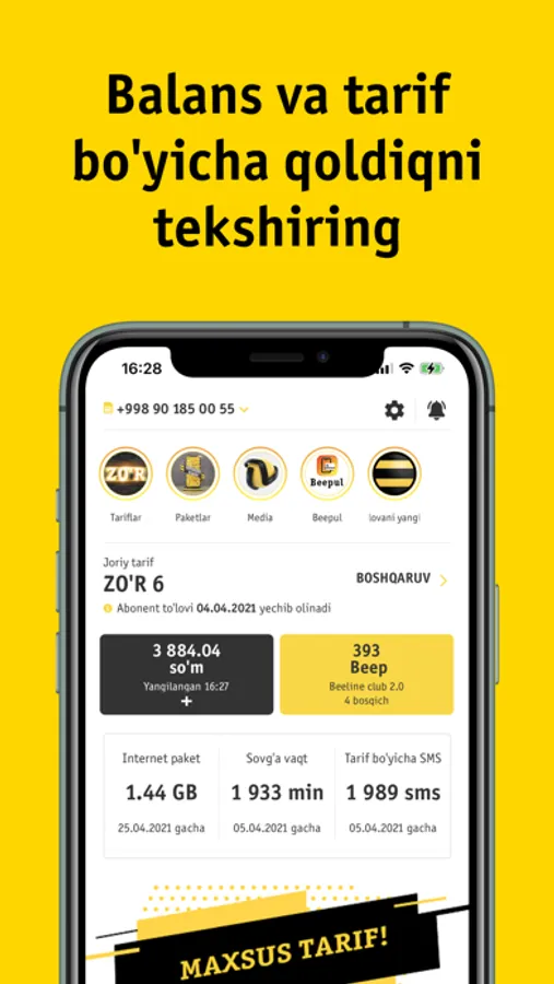Smartfoningizda "Beeline (Uzbekistan)" mobil ilovasini o'rnating va raqamingizni boshqarish uchun oddiy va qulay vositaga ega bo'ling.
