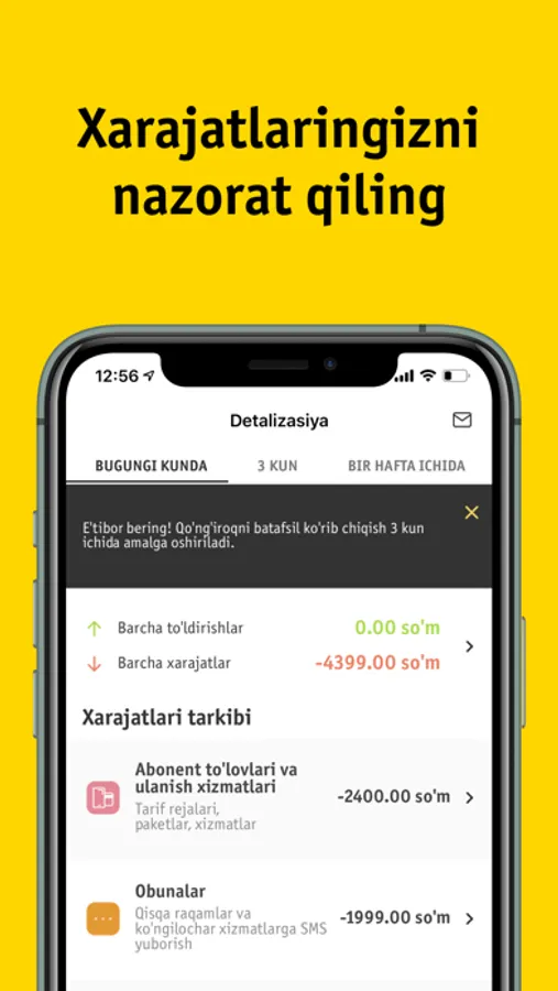 Ilovaning o'zida detalizatsiya ma'lumotlarni ko'rish va xarajatlar haqida detalizatsiya ma'lumotlarni elektron pochta orqali olish;