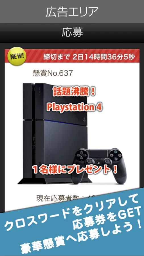 クロスワードの問題1問を、全部マスを埋めて正解すると、応募券がゲットできるようになりました。