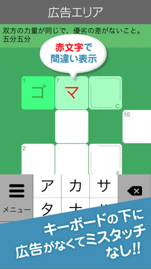 ヒントコインが使われたマスに入力されている解答が間違っている場合には、赤色でマーキングされます。