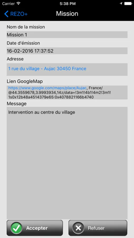 - recevoir des missions en temps temps réel émis depuis un PC utilisant REZO+ PC Inline. Une mission est caractérisée par une adresse d'intervention et d'un message décrivant la mission à effectuer.