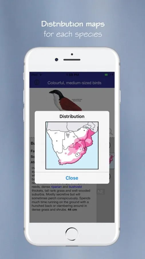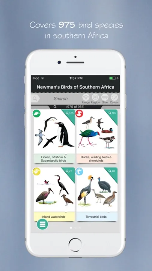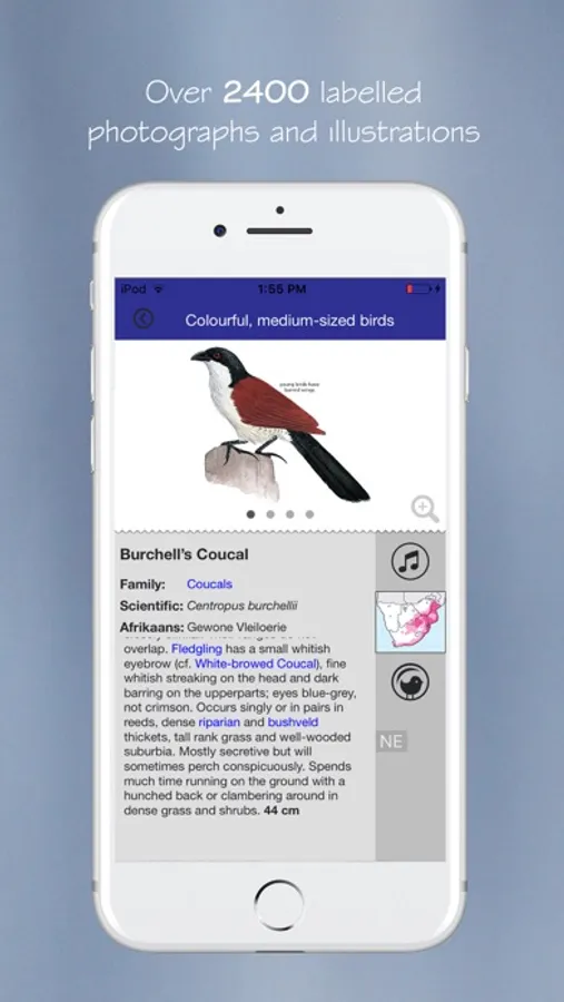 Try before you buy – there is a free lite version with full app functionality, limited to 60 species, so that you can see how it works before purchasing this app. Search for Newman's Birds of Southern Africa LITE.
