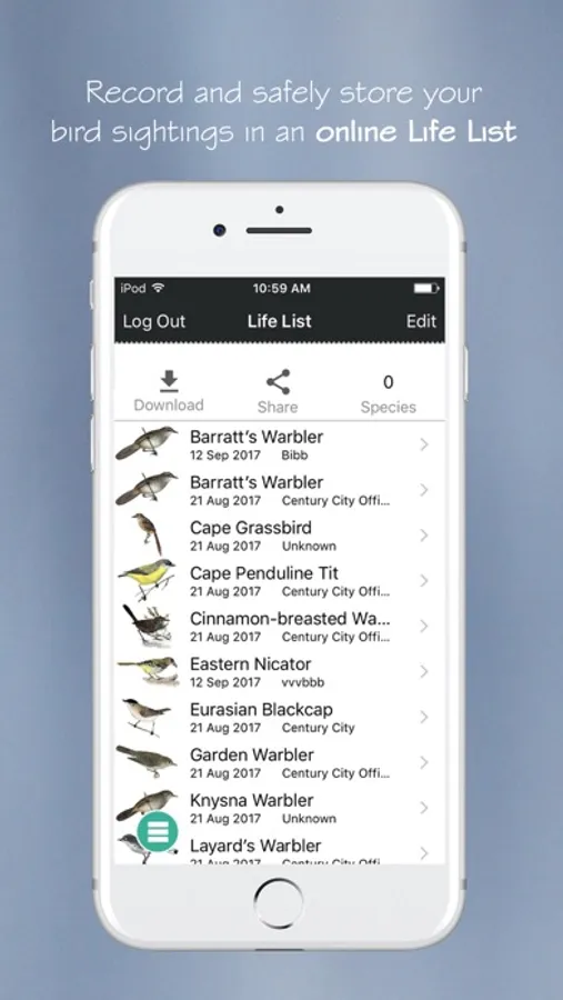 This app includes a cloud-based life list that stores your sightings online. You need to log in to the life list while you have internet connectivity, but once logged in, you can add sightings when you don’t have an internet connection. When you next connect to the internet, the life list will sync, and your new entries should be added to your list. The life list will sync to all your devices that have the app installed and where you are logged in with the same details.