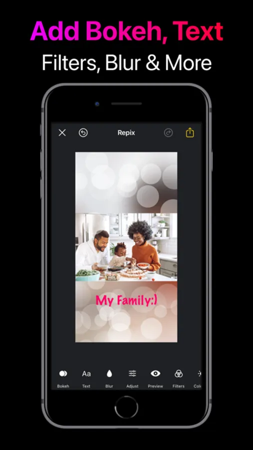 + Blur, Bokeh, Text, Adjustment, Filters, Colorize, Pattern, Splash Effects