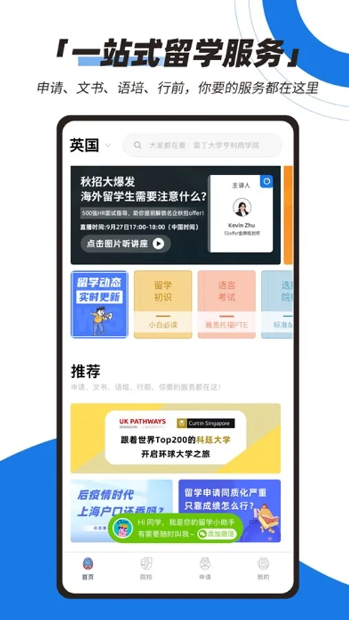 51offer留学致力于用互联网让留学更简单,通过App让来自于上海、北京的资深顾问老师来为全国各地的学生,提供优质的一站式留学服务;Ai智能选校方案、服务标准收费、申请全程透明。