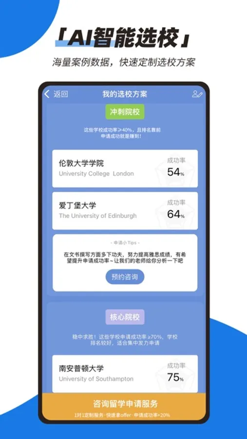 十几年留学服务沉淀、数十万留学案例支持,历时4年不断迭代,Ai智能选校,快速帮你完成选校定位!