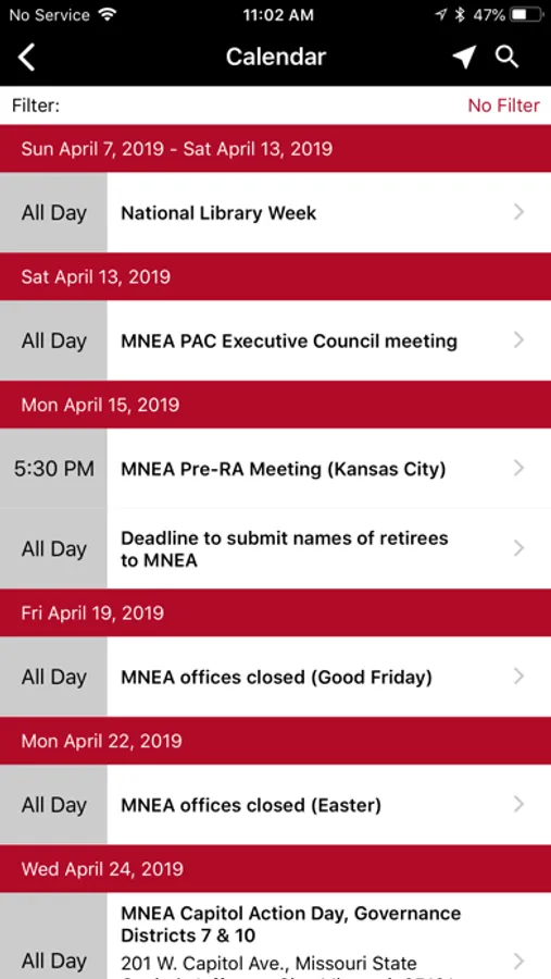 Still want more interaction? You can look up legislators and find contact information for them. The app features a location services center that helps you look up the MNEA offices as well as Missouri school districts, school buildings and colleges and universities. The location services center also maps out a route for you and shows you how to get there!
