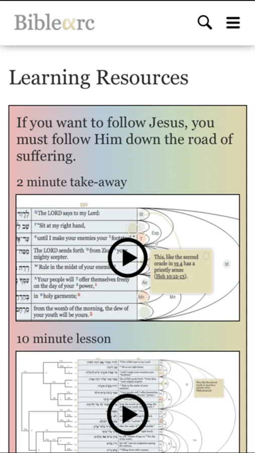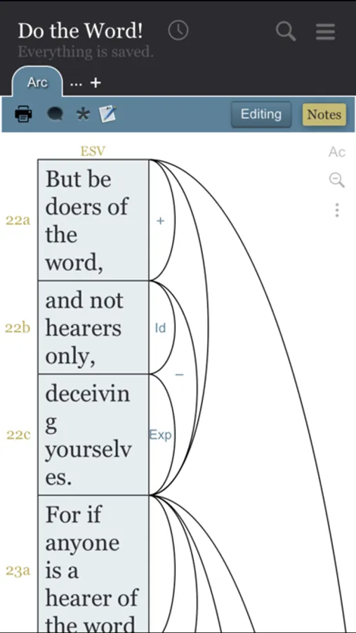 Create Bible study projects. Study the Greek and Hebrew text (NA28, WLC, LXX, SBL) with the help of lexicons and parsing information. Benefit from cross-references and study notes with the most accurate and scholarly Bible translations. Compose complex searches of the original languages along with lightning-fast queries of the English Bible. Use the well-tested study methods of Arcing, Bracketing, Phrasing and Sentence Diagramming to get at the author's meaning. Share your work with others via groups, classes, links and email. Projects are automatically saved and synced with Biblearc on your Mac and PC.
