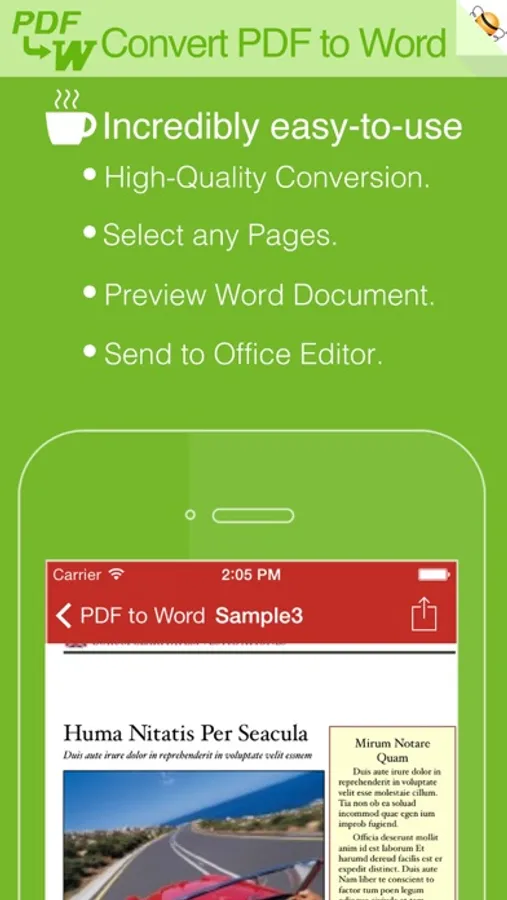 PDF to Word is an utility designed to convert Adobe PDF document to Microsoft Office Word files(.docx), PDF to Word can keep the original content, layout and formatting for easier editing or reusing the content, support opened in popular mobile office editor app(such as: Microsoft Office Mobile, Polaris Office, Smart Office or QuickOffice).