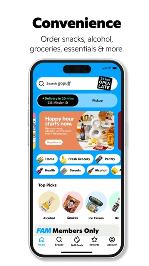 Gopuff Fam members pay $0 delivery fees on every order, any time of day. We offer monthly and annual subscriptions.