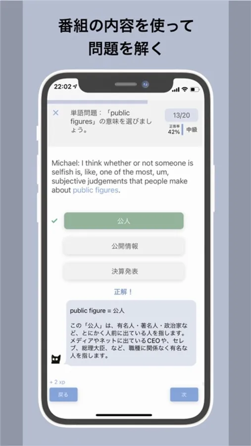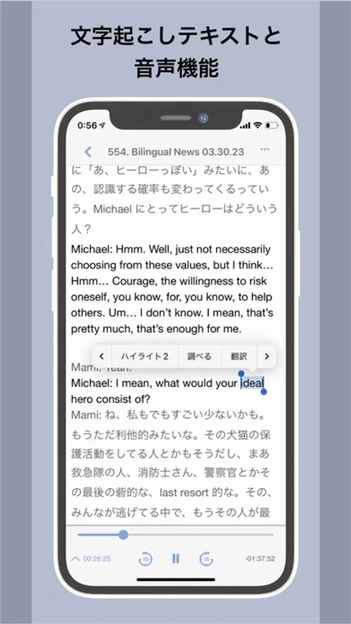 Bilingual News offers free conversations on current events and special guest episodes conducted in mixture of English and Japanese. Use transcripts to listen with the podcast audio and look up new words, create word lists and maximize your Japanese study. The app also has word lists for each episode, a vocabulary quiz, a social competitive game mode and episode-based study worksheets.