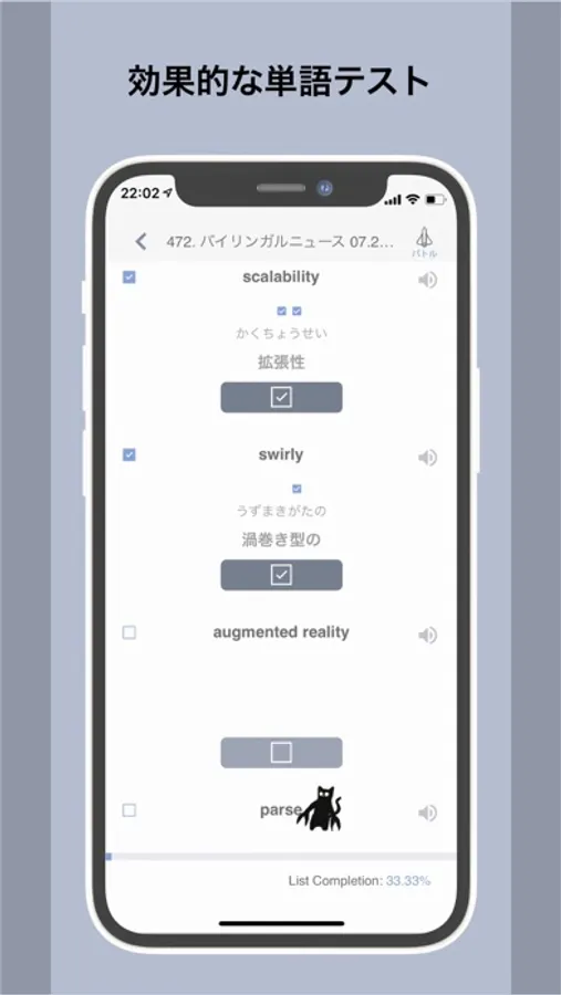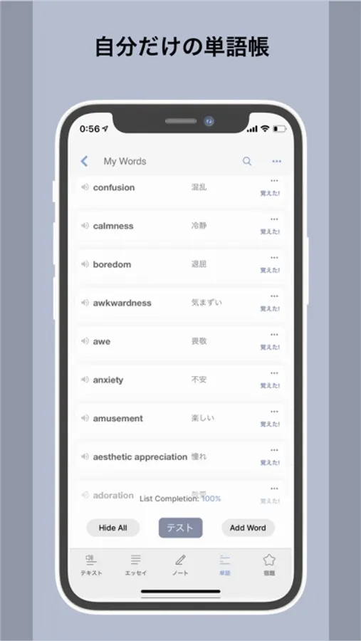 A scroll-feed style format for learning new words. A pet creature evolves onscreen as the user learns and progress. Add words to your lists by selecting any word in a Transcript or Essay and tapping "Add".