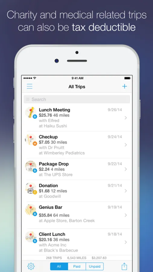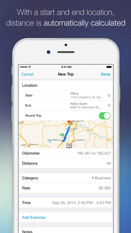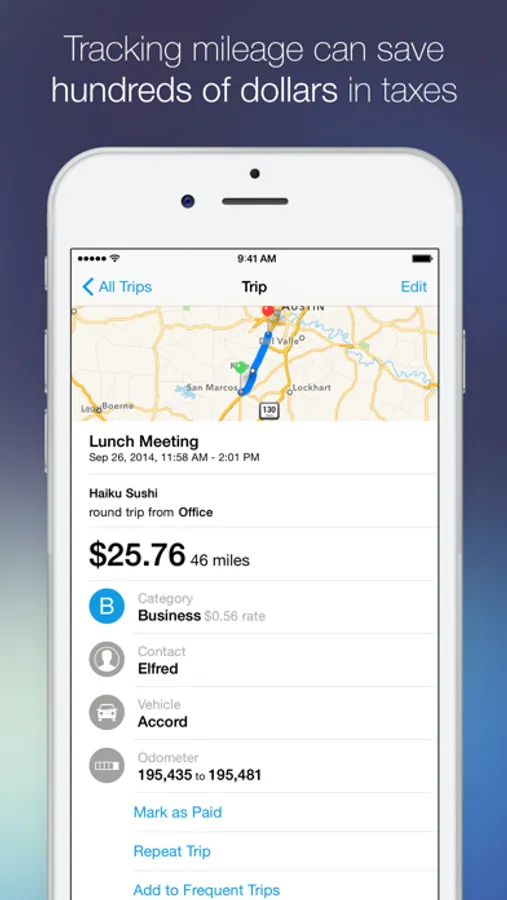 Use Mileage Log+ for tax deductions, expense tracking, reimbursement and logging business trips.