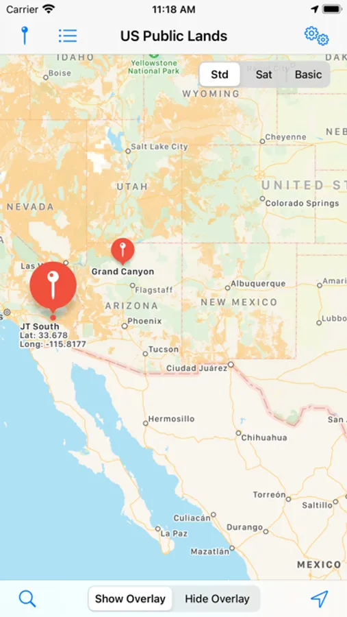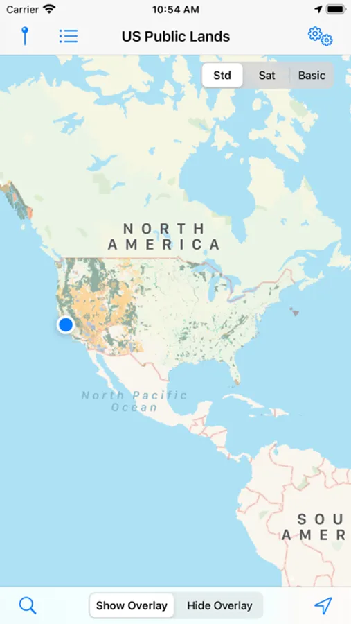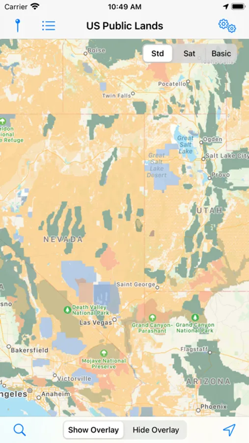 - Be sure to turn on the 'Basic' base map to see the US Public Land labels for each land area. This base map layer is also stored entirely on your device, and can be utilized if you do not have an internet connection or would like to conserve bandwidth.