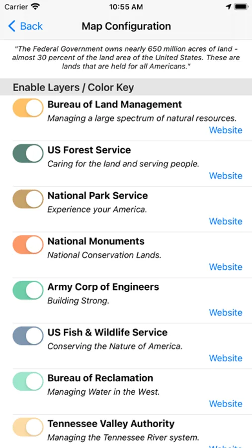 - Know which US agency owns and operates the land you're on or are heading to. Use the "Layers" icon to select which agencies you want displayed to create your own custom map. (Hint, the toggles are color coded to the color each layer is displayed in.)
