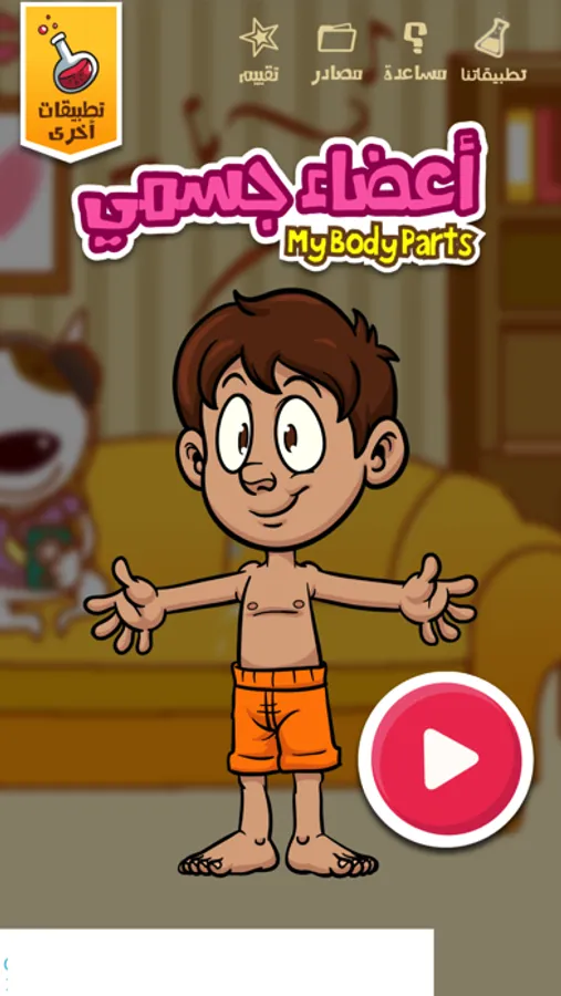تطبيق لتعليم الاطفال اسماء اجزاء الجسم باللغة الانجليزية بطريقة جذابة ومميزة بحيث يقوم الطفل بالنقر على احد اجزاء الجسم ليستمع الى النطق الصحيح لهذا الجزء