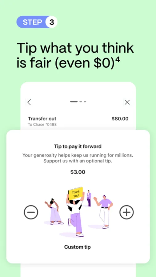 [3] Tip Yourself Account funds are held with Evolve Bank & Trust, member FDIC and FDIC insured up to $250,000. Tip Yourself is a 0% Annual Percentage Yield and $0 monthly fee service. Your Tip Yourself Account and any Tip Jars are not Savings Accounts.
