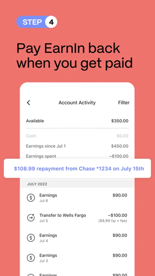 Here’s how it works: If you transfer $100 of your earnings, you get $100. Add an optional tip to support the EarnIn community, and that’s it.[2] When payday comes around, we’ll deduct the $100 you previously transferred from your direct deposit plus any tips.