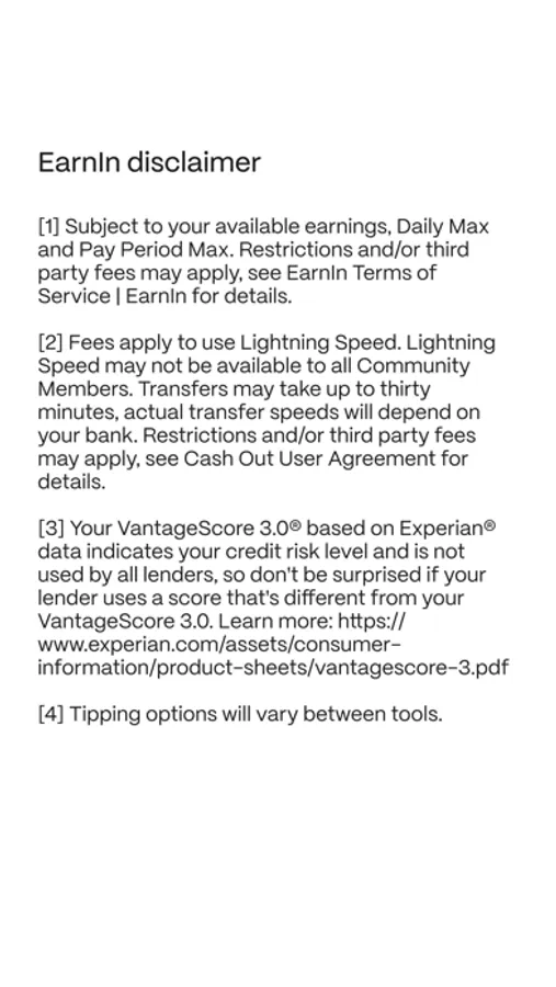 EarnIn is not affiliated with Chime, Dave, Albert, Brigit, CashNetUSA, Empower, Klover, MoneyLion, Cleo, Cash App, Daily Pay, Google Pay or Credit Karma.