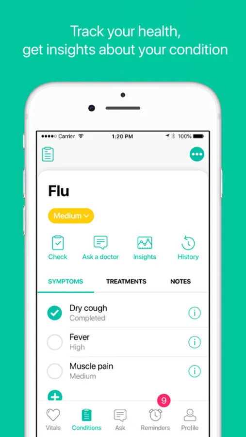 We let you store and manage all your past and present symptoms and conditions, log treatments, set medication schedules and reminders, check drug and allergy interactions, upload lab results and images, and explore your health data using a set of visual charts and reports. The feature integrates with Apple's HealthKit.