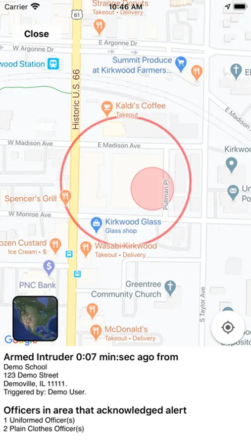 The app alerts the officers, displays a mapped location of the school, reports how many uniformed and plain clothes officers have acknowledged the alert AND provides a timer from the onset of the initial alert.