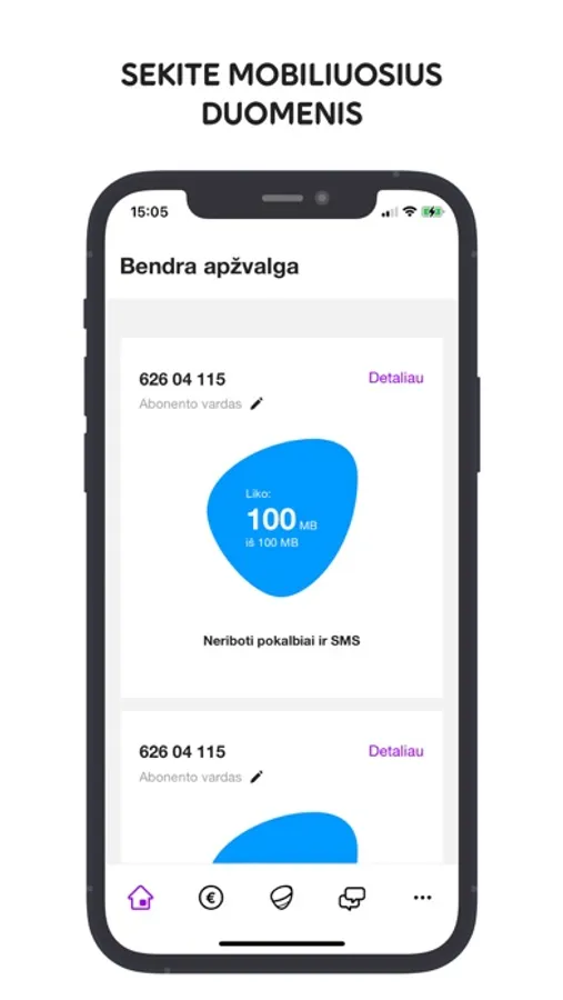 - sužinoti kiekvieno savo turimo mobiliojo telefono numerio išnaudotų interneto duomenų, minučių bei žinučių kiekį vienu prisijungimu;