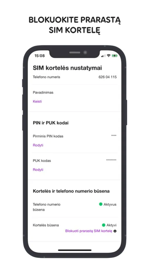 - blokuoti/atblokuoti prarastą SIM kortelę;