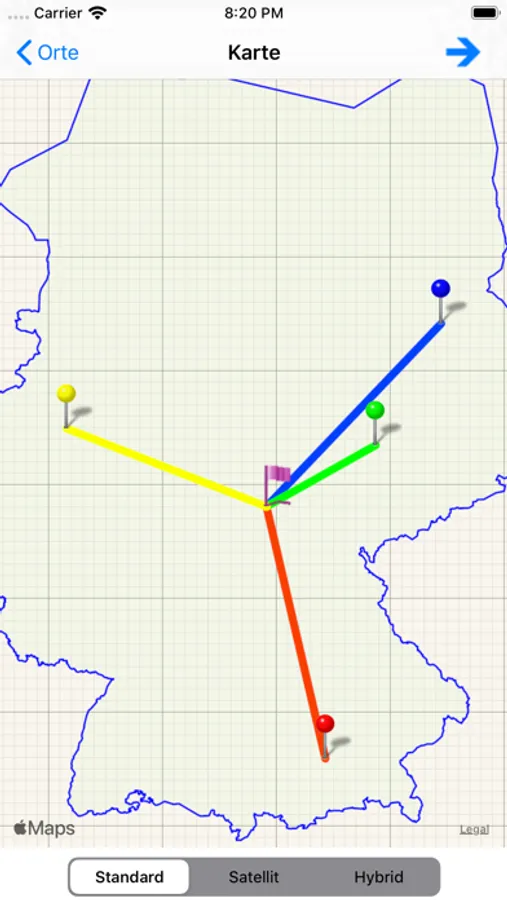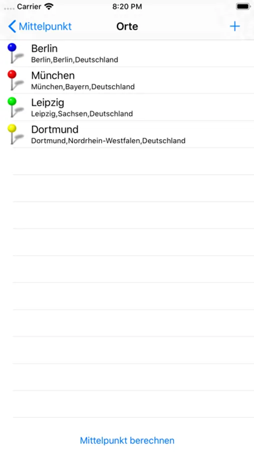 Diese App bietet dir einen komfortablen Weg, den Mittelpunkt von bis zu 9 Orten zu berechnen.