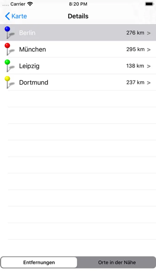 Der Mittelpunkt wird dir in der Karte angezeigt. Außerdem erhätlst du eine Liste mit Orten in der Nähe. Für jeden Ort bekommst du nähere Informationen und kannst z.B. gleich ein Hotel suchen.