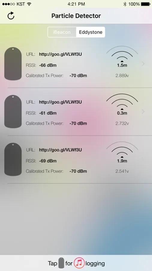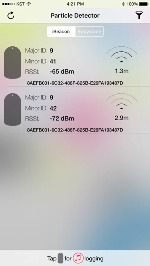 Particle Detector turns your iPhone, iPod Touch, or iPad into wireless, Bluetooth Low Energy scanner that may be used to find iBeacon™ and Eddystone beacons. Once discovered by UUID, Particle Detector displays Major ID, Minor ID, Signal Strength, and timestamp for last moment of discovery. New UUID filters may be added for quick discovery.