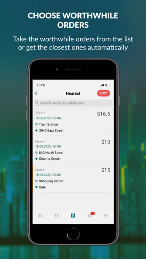 Filter orders by rate and destination to select the most suitable orders for you from the list. Alternatively, you can enable a mode in which our service offers you the nearest orders automatically, allowing you to complete them one by one. This lets you earn more while spending less time and fuel.