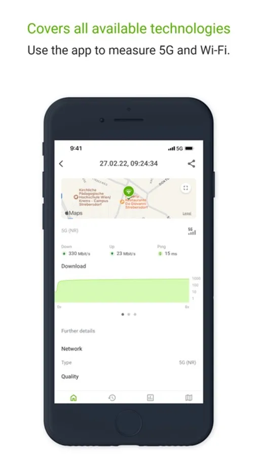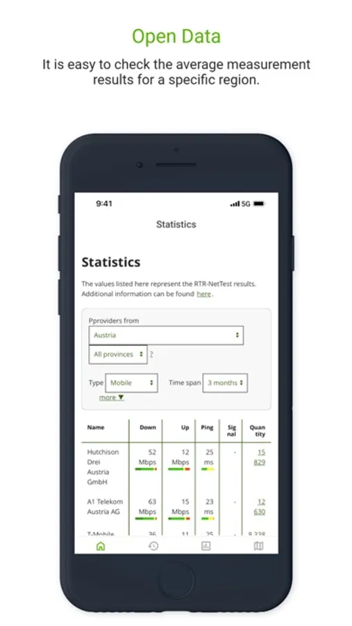 The results of the RTR-NetTests are available as Open Data (https://www.netztest.at/en/Opendata ) and are shown in the map view as heatmap or as coloured dots. In addition, there are additional options to filter the results according to various criteria. You can tap each measuring point for more details.