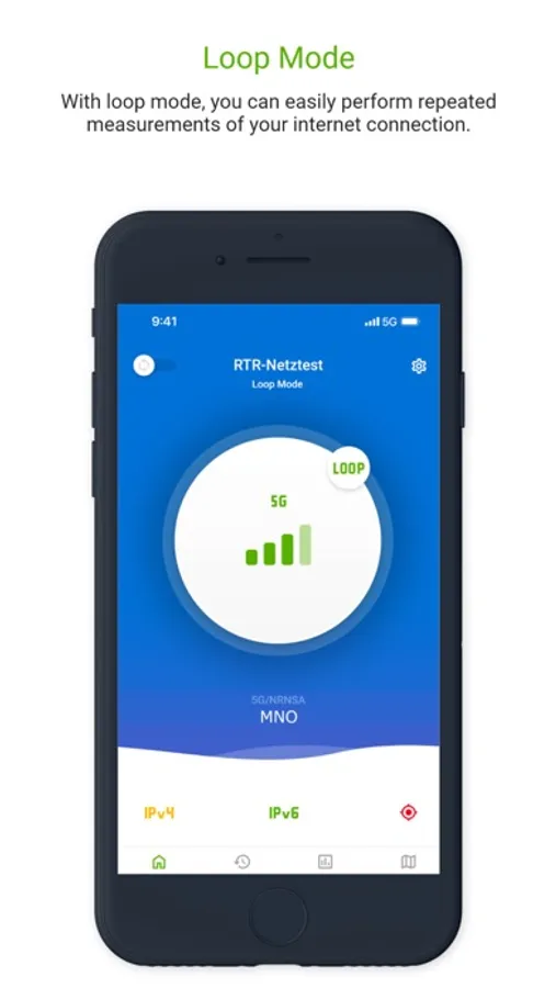The start page provides information about the cellular or WLAN connection. The RTR-NetTest is carried out by pressing the "START" button. If the loop mode has been activated, the "LOOP" button will appear instead of the “START” button. The loop mode enables the RTR-NetTest to be repeated automatically. The tests will start as soon as the waiting time has elapsed or the specified distance has been covered.