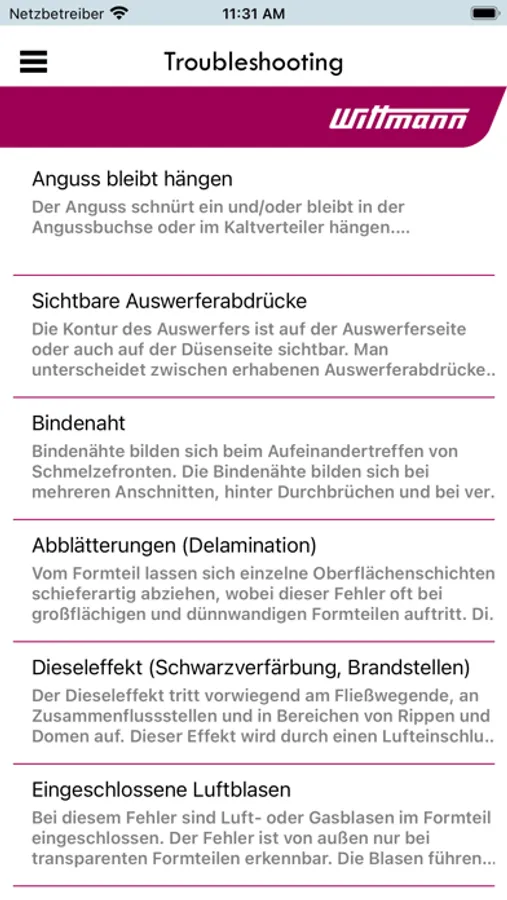 “WIBA Assist” also provides a button for trouble-shooting, where a description of the most frequent injection molding faults and defects including suggestions for remedial action can be retrieved.