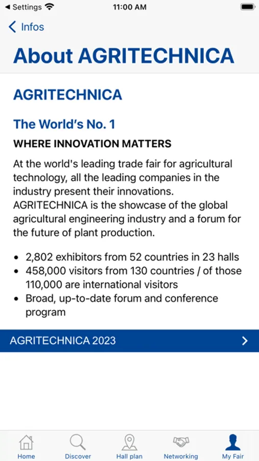 Plan your meetings at AGRITECHNICA. No matter whether you are scheduling your meetings with exhibitors or your participation in our technical program. This function gives you an optimal overview of all scheduled on-site activities by days, including a route display that always shows you the shortest route to your destination.