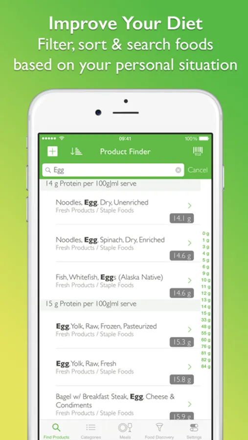 • In addition to the standard search from A - Z , the app provides a sorting function by nutrient, by food group, or any search term you can imagine