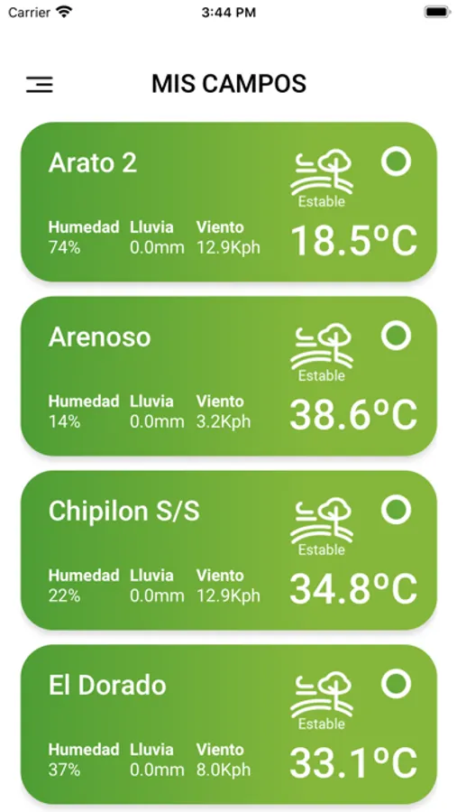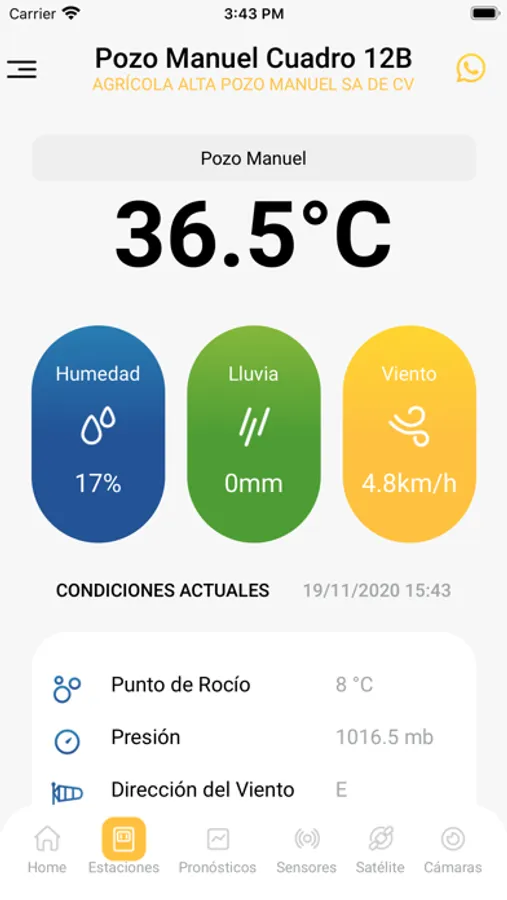 Pronósticos de temperatura, humedad, viento, precipitación, nubosidad, presión, visibilidad, radiación, punto de rocío y temperatura del suelo.