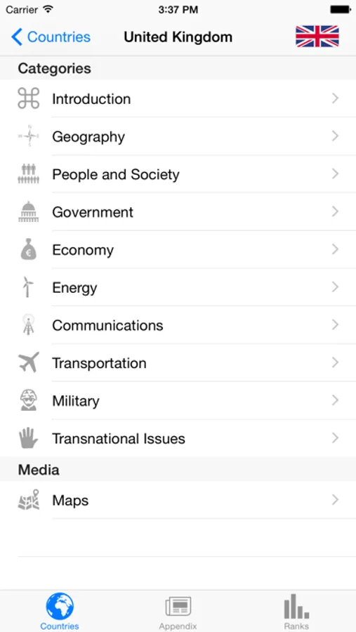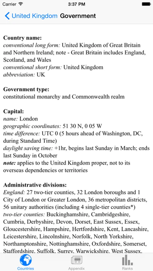 The World Factbook Facts provides you to read and learn many different information about all countries in the world(about 260 countries!). You can read about: