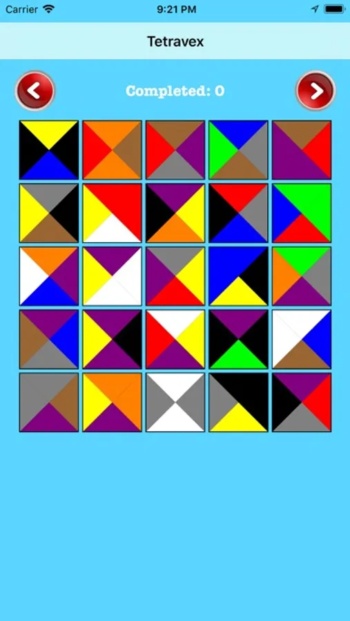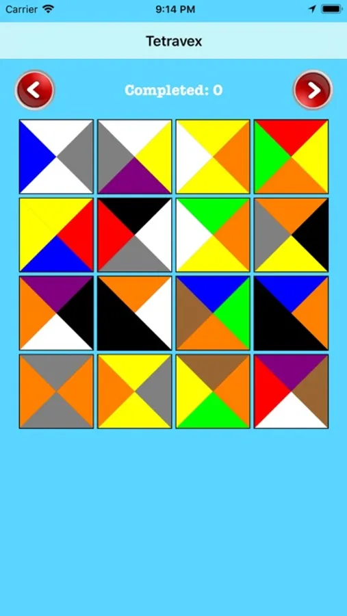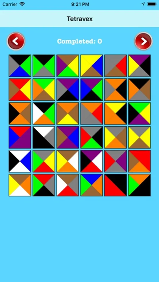 TetraVex is an edge-matching puzzle. The player is presented with a grid (by default, 4x4) and sixteen square tiles, each with a color on each edge. The objective of the game is to place the tiles in the grid in the proper position as fast as possible. Two tiles can only be placed next to each other if the color on adjacent faces match.