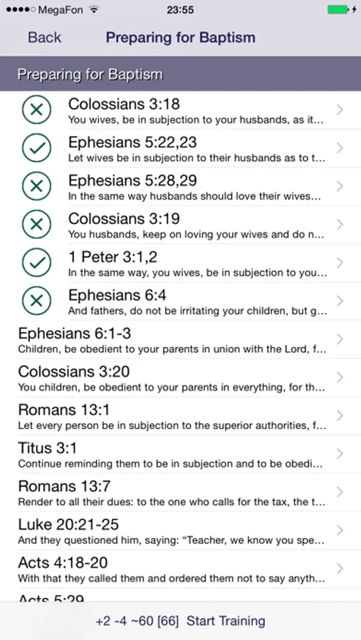 3) You can train your memory, selecting the subject and pressing the 'Start learning'; program will offer you the index of the verse and text options . To guess the correct verse, so you can see your results and train your memory.