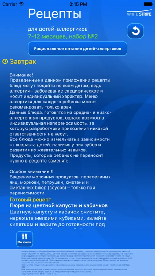 В приложении представлены рецепты блюд, которые готовятся из средне- и низко- аллергенных продуктов. Однако не стоит забывать о том, что при детской аллергии возможна индивидуальная непереносимость!