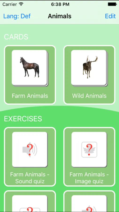 Learn with your child animals names with two set of colorful cards and three kind of quizzes. The cards are specially designed for children up to 5 years. Each card includes a picture, text and pronunciation in eight languages. You can also personalize any card, change an inscription, and record your own voice. To do this, press “Change” button on the cards list screen, then press the blue “Edit” button which will pop up in the upper right corner of each card.
