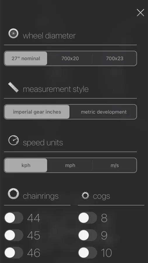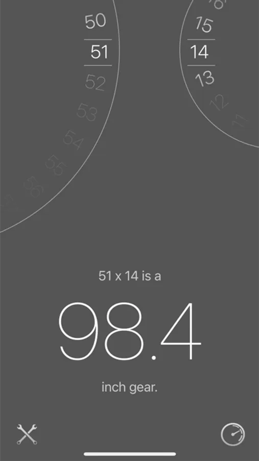 Want a bigger gear or a smaller gear? Track Gear Calculator works in reverse, too: just swipe the gear inches, and you'll get a new gear, up or down from where you are, using only the chainrings and cogs you have with you. You can also select from the standard 27" nominal method for calculating gears, or more accurate actual wheel diameters, and you can see results in either Imperial gear inches or Metric development.