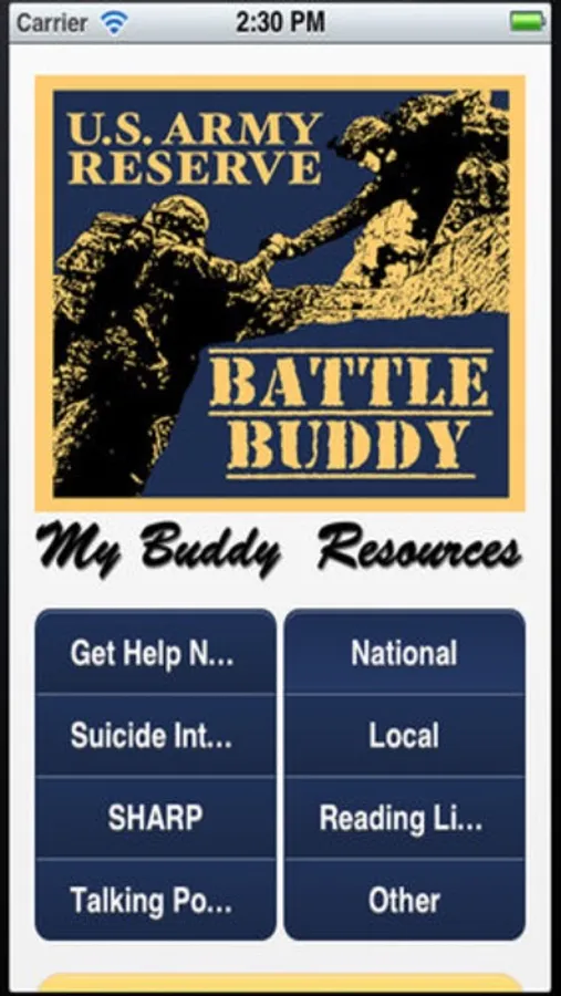 This app helps you be a good Battle Buddy by giving you the tools and information needed to assist your buddy during a crisis. It also provides tips and tools to help you intervene before the situation reaches crisis proportions. This app is organized into two primary areas, “My Buddies” and “My Resources”.