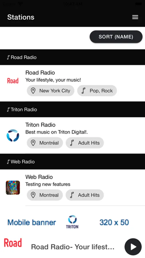 Triton Radio serves as a demo application for our clients with an active radio stream, player controls and a full feature set including additional 'now playing' information, song history, station list, sharing options, news, local weather and alarm settings..