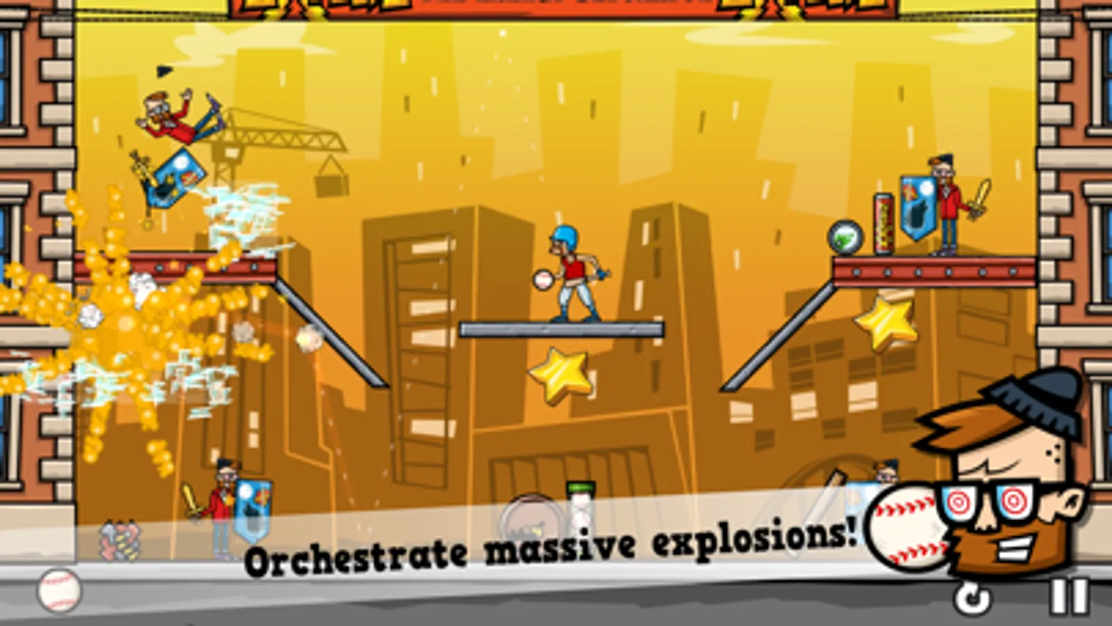 Baseball Riot is a free physics based puzzle game loaded with comedy and mayhem! Take control of retired star batter Gabe Carpaccio as he goes on a crusade to free his former team from the grasp of Explodz Inc. Smash baseballs at various Explodz fueled goons, bounce the ball of walls and platforms to knock out many targets at once and even detonate Explodz craters to launch the baddies sky high! See the enemies tumble as hapless ragdolls and try to master each level by collecting three stars.