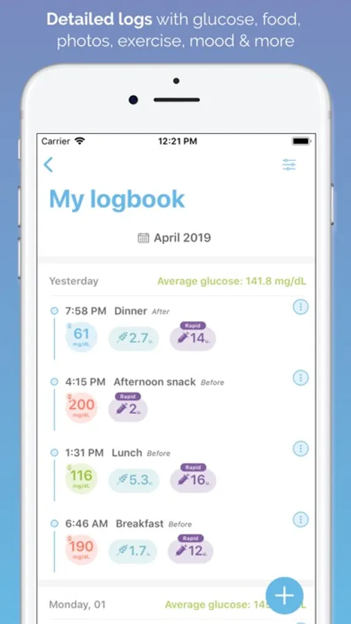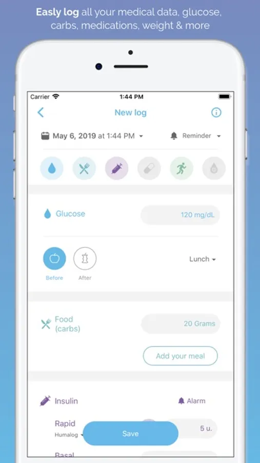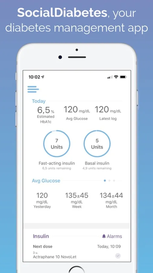 Type 1 and Type 2 diabetes care requires a lot of tracking. With SocialDiabetes, register all the relevant information to your treatment such as blood glucose levels, insulin, carbs, medicaments or physical activity.