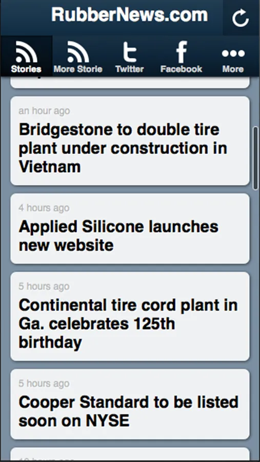 Rubber & Plastics News (rubbernews.com) provides international rubber industry news, this app delivers the latest news about rubber technology and products, marketing and executive action.