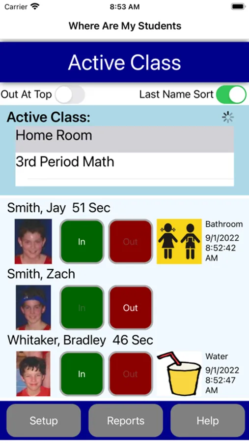 Whenever a student is checked out of the room, a handy on-screen timer appears next to that student’s name. This is a huge help to teachers of all levels, elementary through high school, who want to track not only who is out of the room and where they are, but for how long they have been gone.
