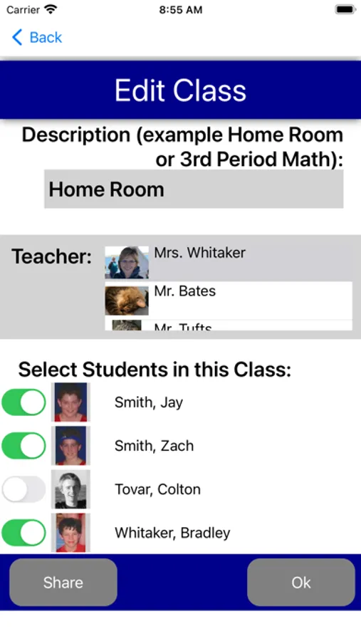 Enter your student names and optional photos; your own categories (Bathroom, Principal, Gifted Programs, etc.); setup your own timers and alarms. The App. is very user friendly and easy to customize.